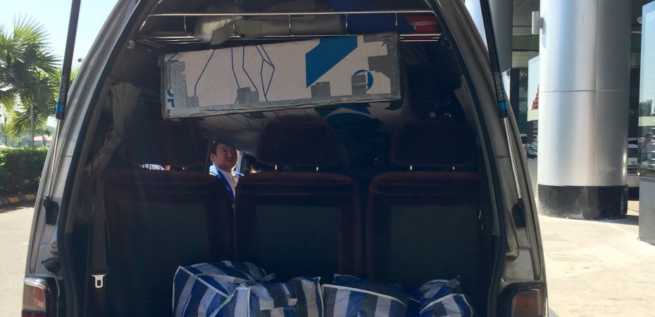 In case of returning to your starting point and re-using the box, you need transport from the airport to your hotel. As Burmese are creative and flexible in transporting nearly everything in or on no matter what vehicle, you’ll easily find transport for the boxed bikes. A minivan (even when it contains ten seats) will do, but chances are big your box fits the most commonly used car by taxi-drivers, the Toyota Probox. The backseat has to be folded down, and drivers will probably charge you some extra for this.
